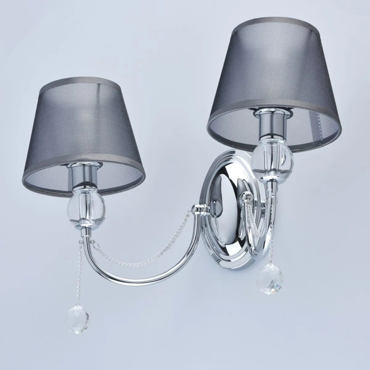 Основание/металл/ хром. Абажур/текстиль/дымчатый. Декор/акрил, хрусталь/прозрачный.